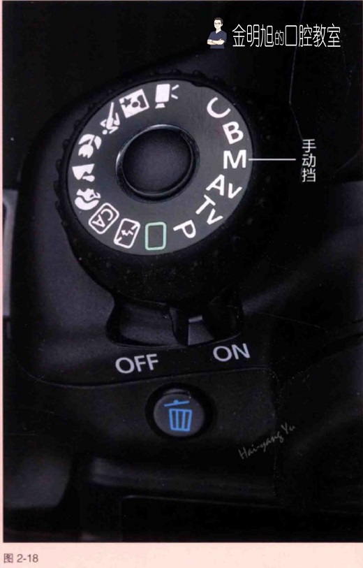 口腔摄影一般使用M挡,也就是手动挡进行拍摄(图2-17)。在M挡下,我们可以自由设置光圈大小与快门速度,以满足拍摄需要。在M挡模式下,调节机身背面大旋钮可以改变光圈大小,而快门速度则由左侧上方小旋钮调节(图2-18~图2-20)。