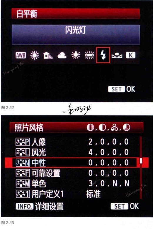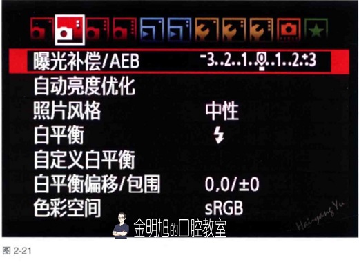 为了保证照片颜色的正常与病例照片的一致,除了设置基本曝光参数外,我们还应该设置正确的白平衡与照片风格(图2-21)。白平衡的选择与光源有关,一般在口腔摄影中使用的光源是闪光灯,因此,我们应当将白平衡设为闪光灯模式(图2-22)。为了保证色彩真实,照片风格应该设为中性(图2-23)。